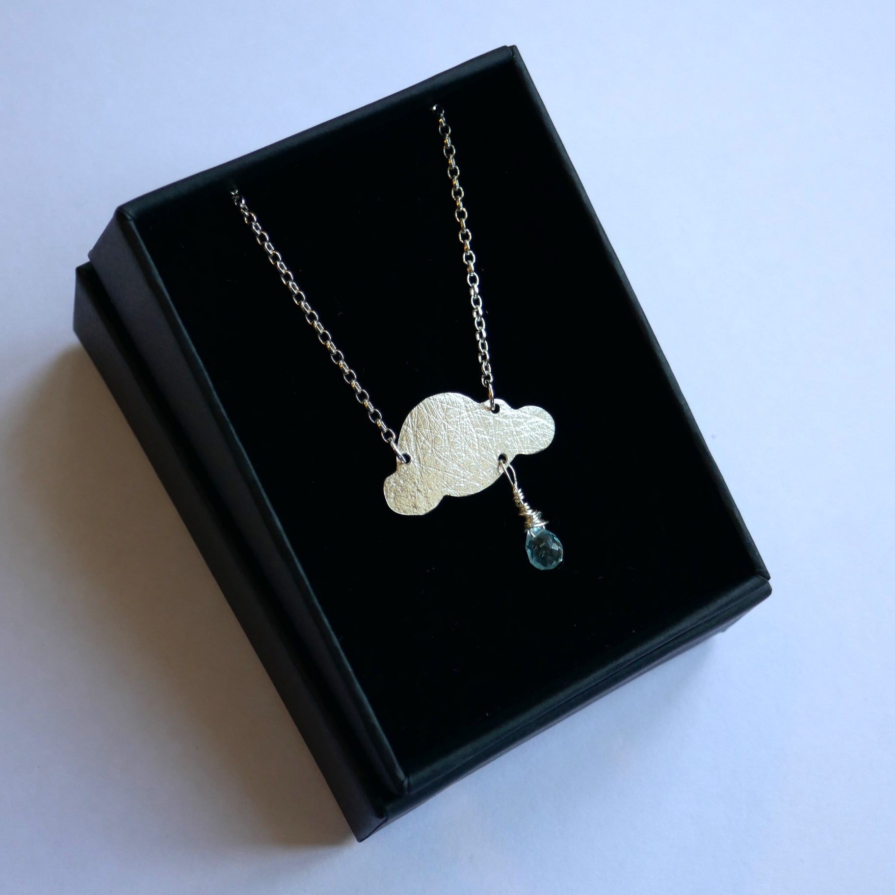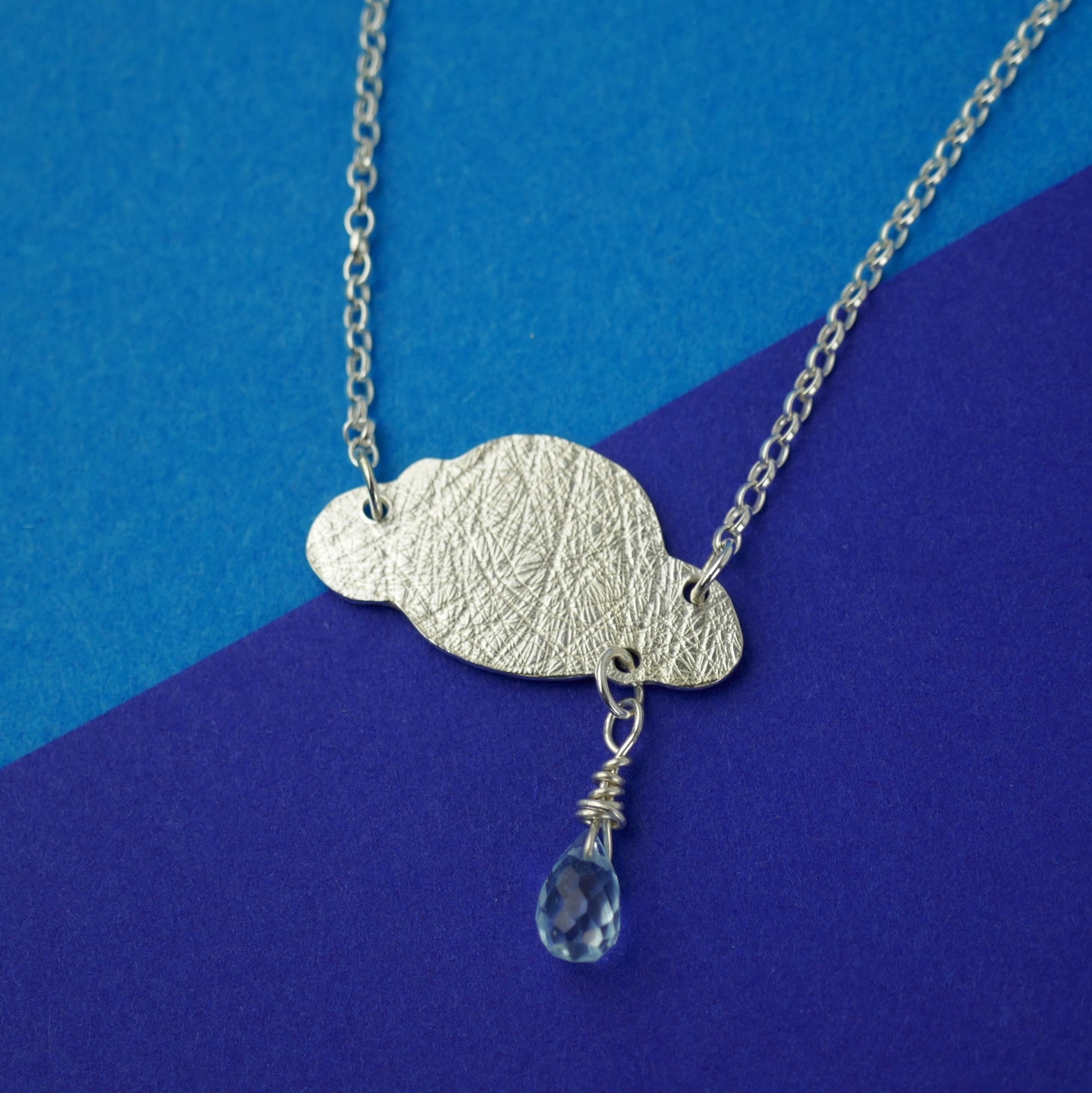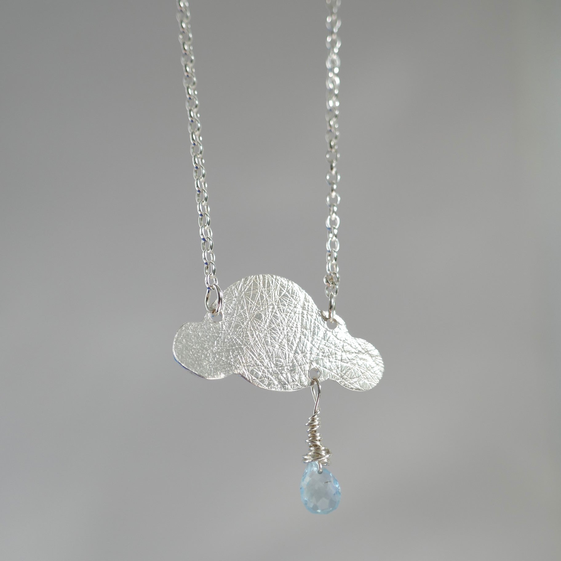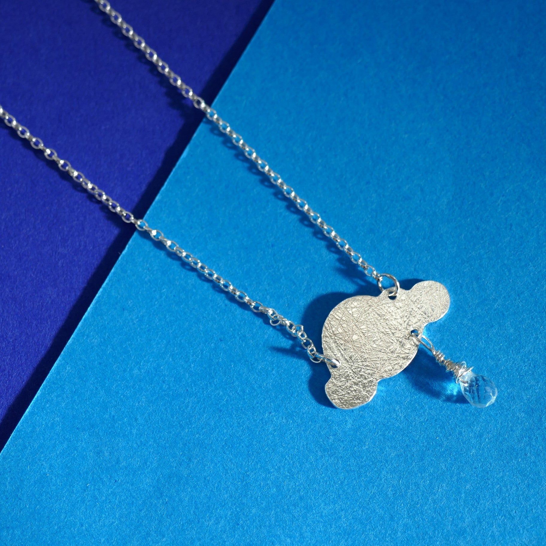 Made from recycled sterling silver this cloud necklace features a blue topaz raindrop and hangs on a 16.5 inch chain. The cloud measures approx 2.5cm across. As this necklace is handmade please note that each cloud might slightly differ in shape.