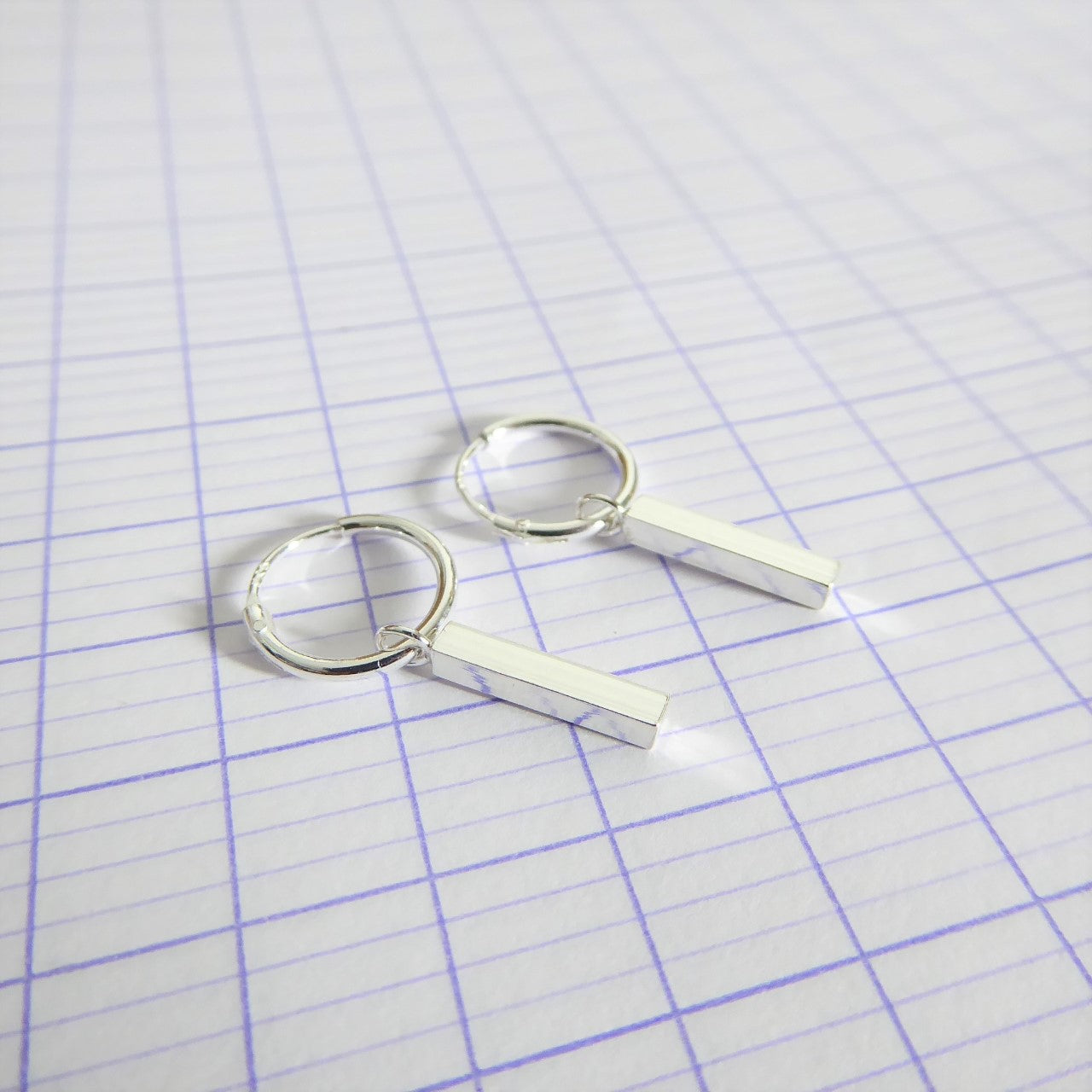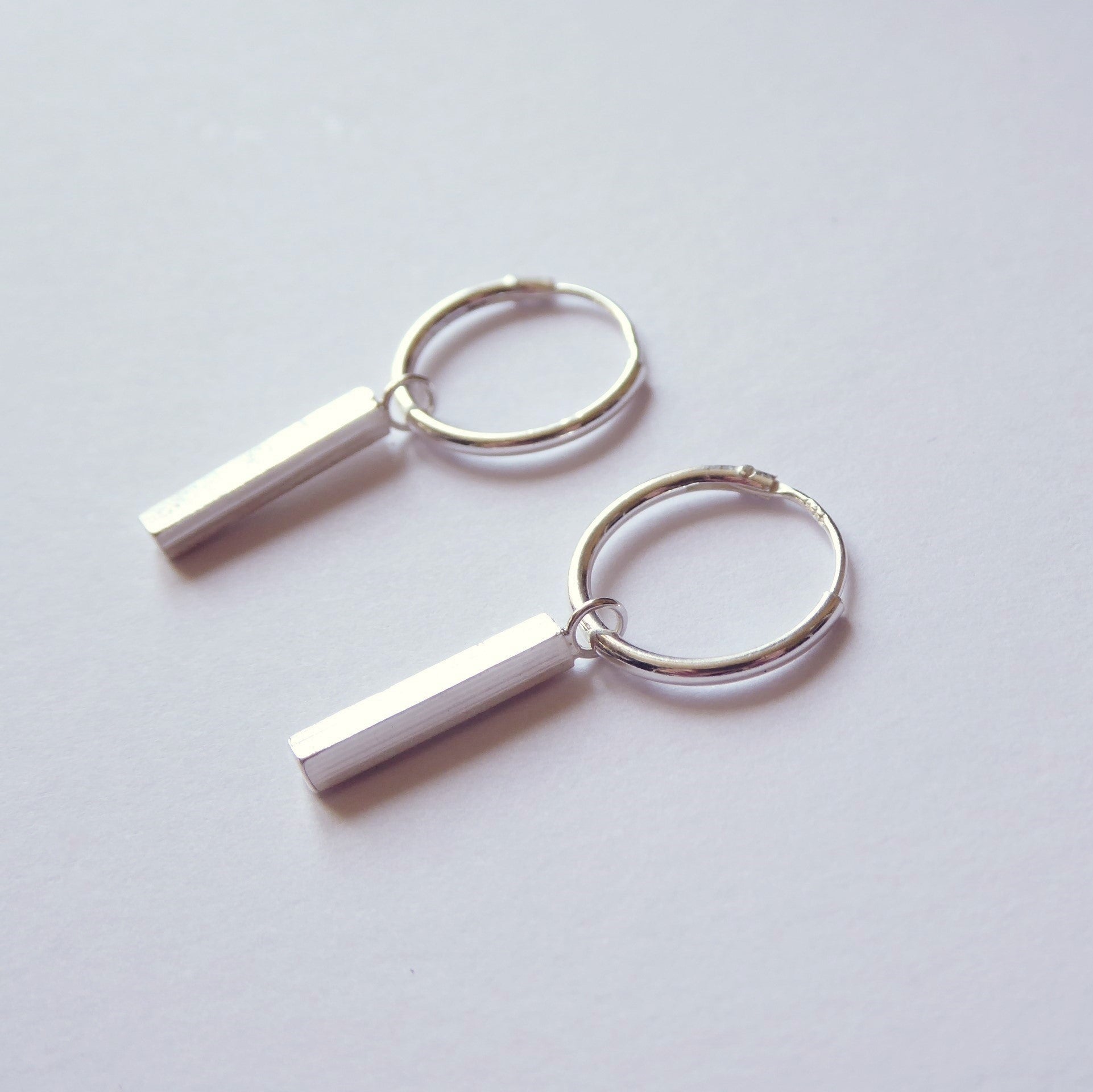 The bars measure approx 12mm and hang from a 14mm sterling silver hoop. These earrings are also available with ear hook if you would prefer. Please select which you would like.