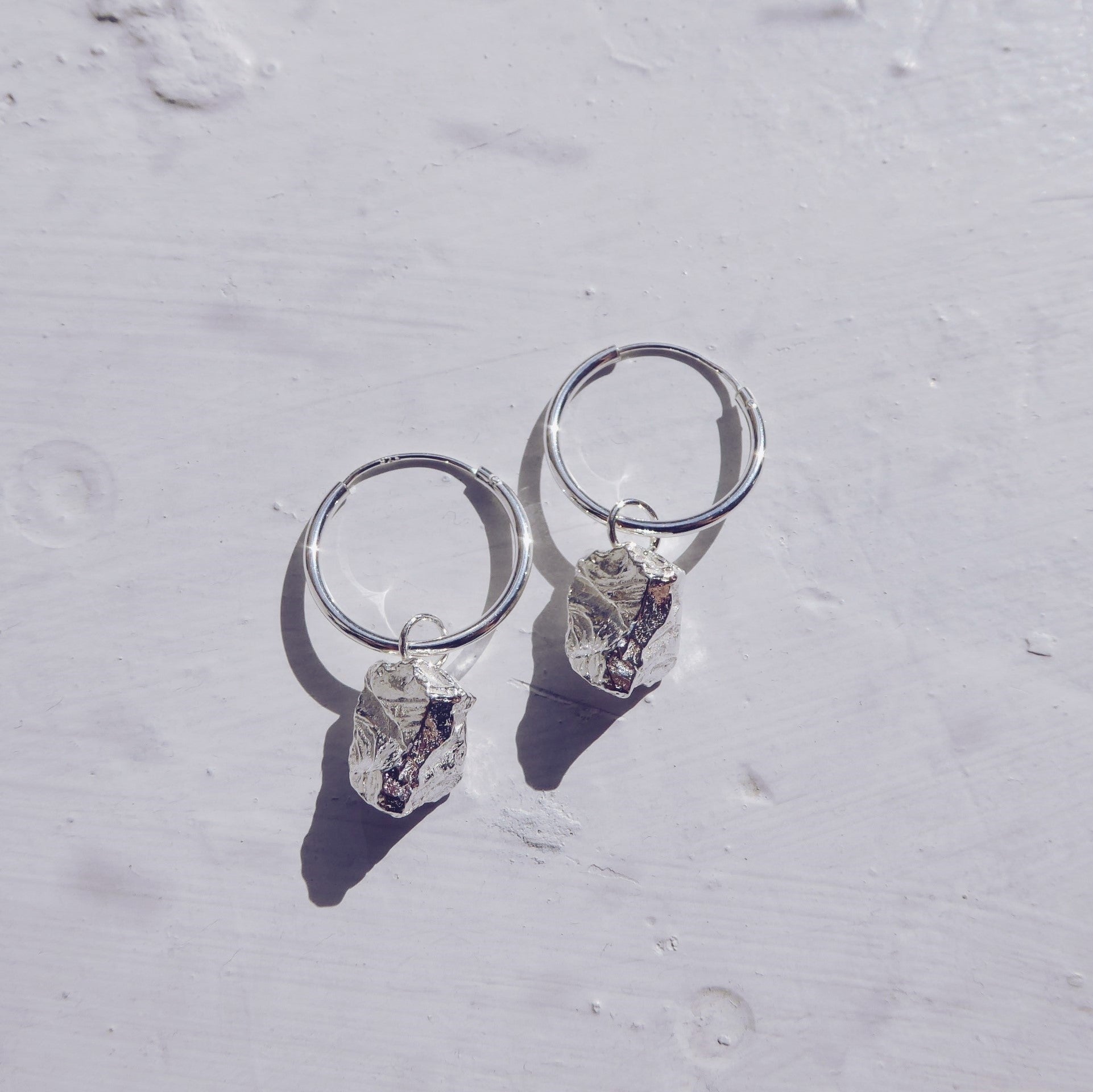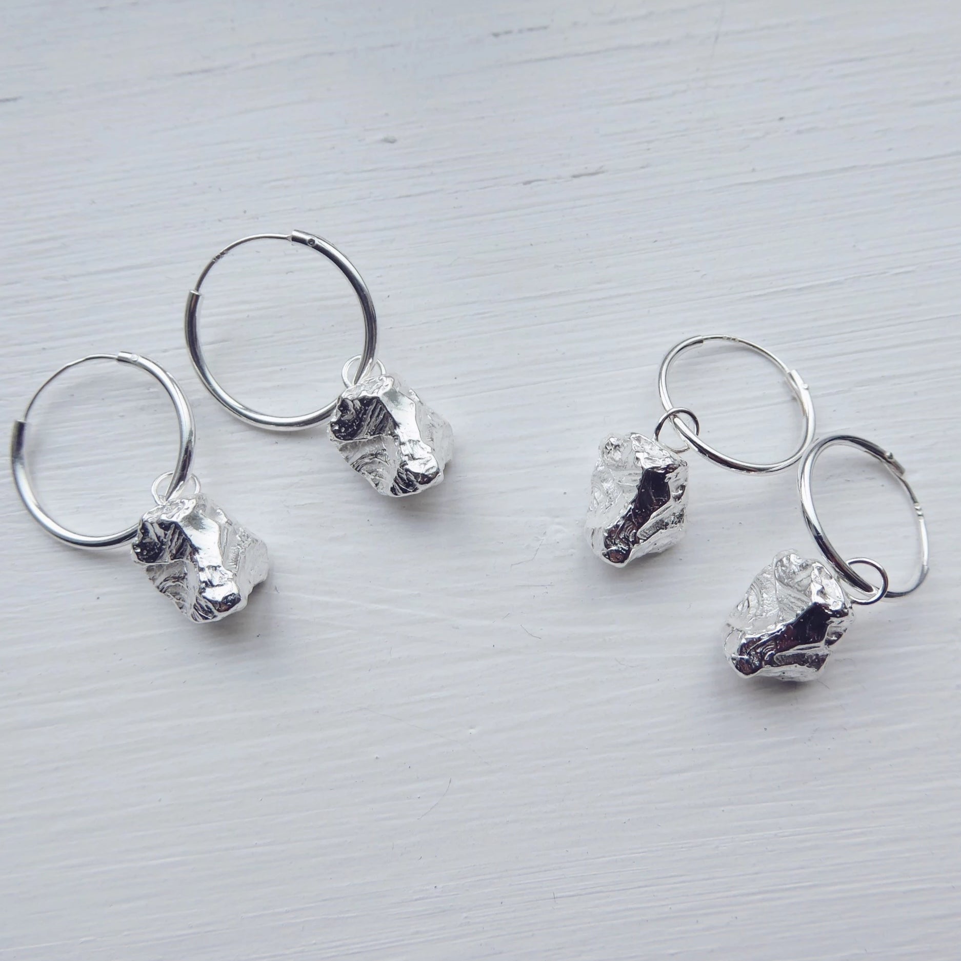 Sterling silver 'meteorites' hang from 18mm ear hoops (pictured on model) or 16mm ear hoops. Please choose which size you would like. See second to last photo for size comparison.