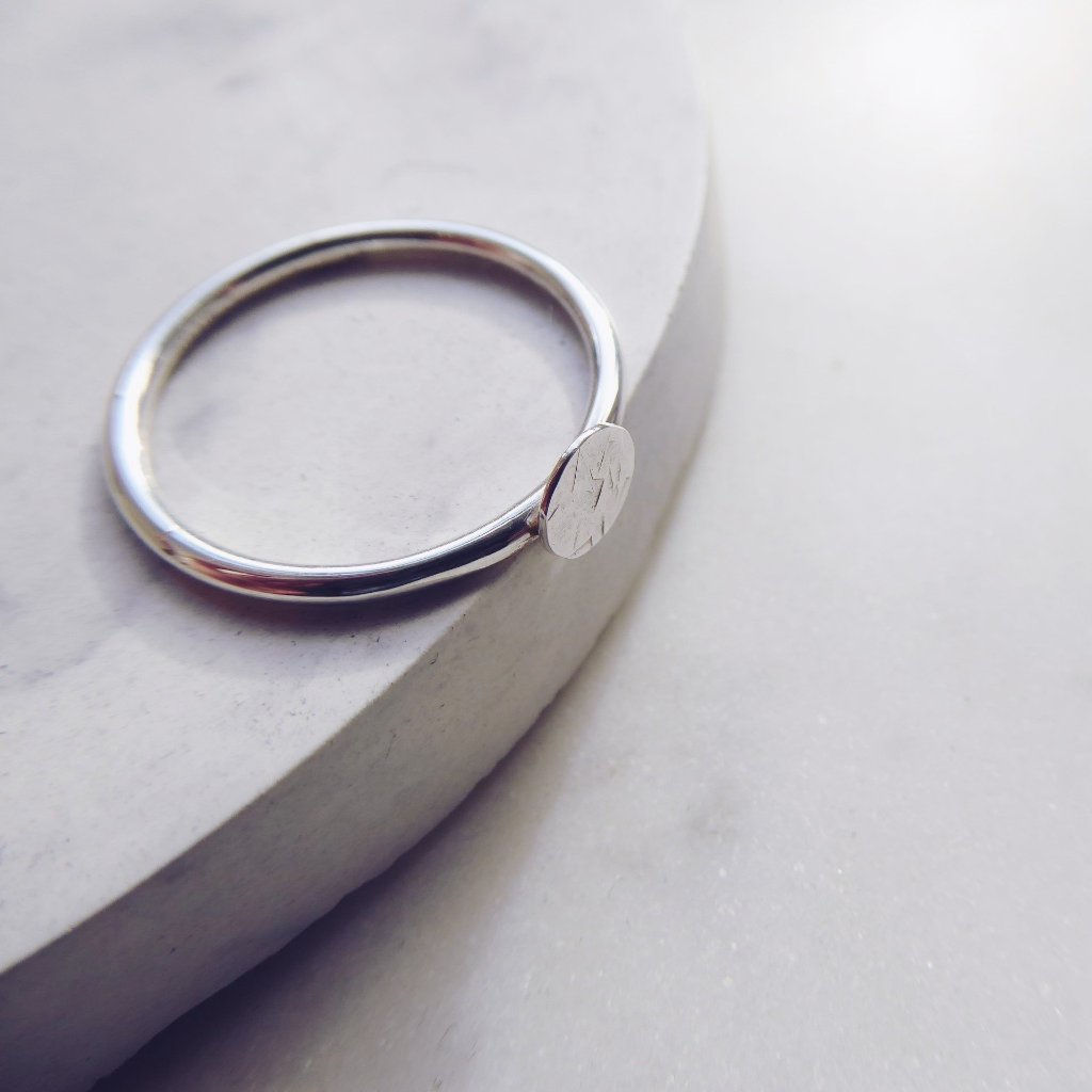 Textured to recreate the surface of the moon, the sterling silver circle sits on a recycled sterling silver round band. This ring is great for stacking with others or worn alone as a minimal statement.