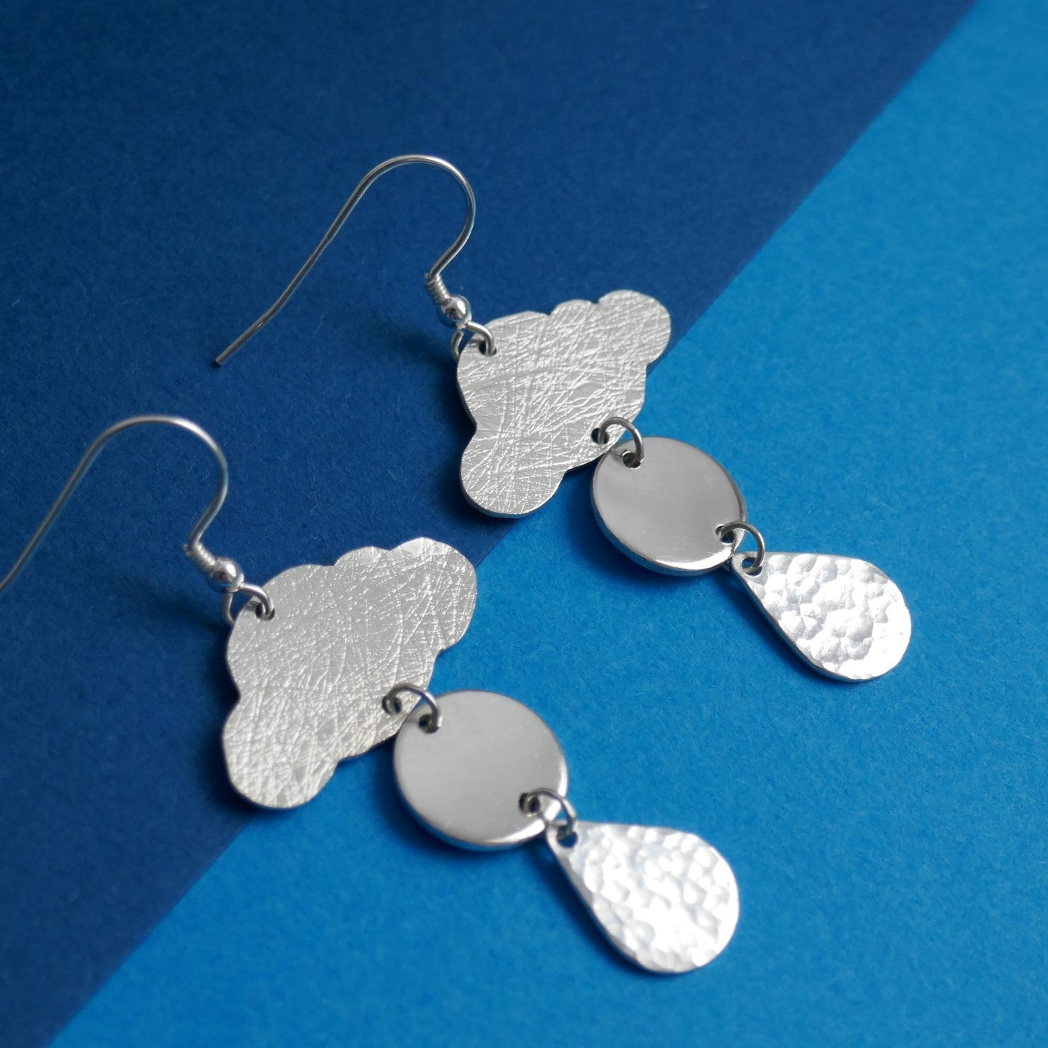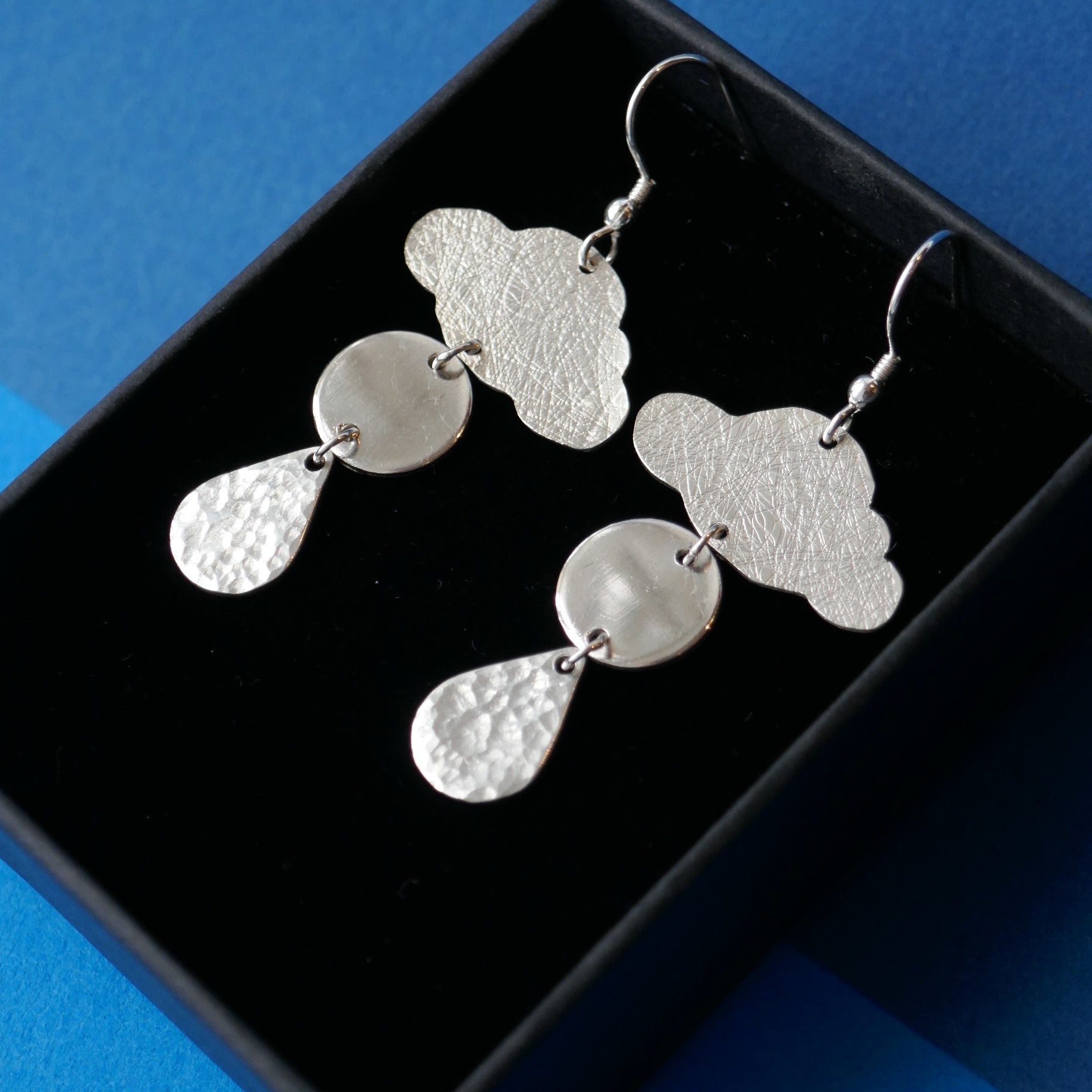 The earrings are approx 4cm in length, each part is connected to allow movement and each different surface texture catches the light beautifully. They are made from sterling silver. As they are handmade please note each cloud might slightly differ in shape. These can be ordered with hooks or hoops - please select which you would like.