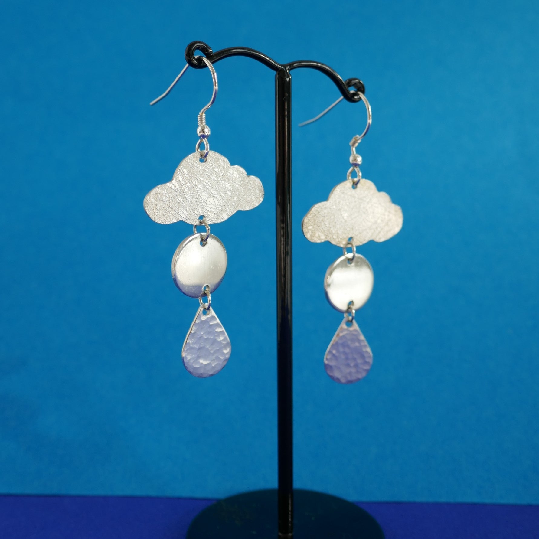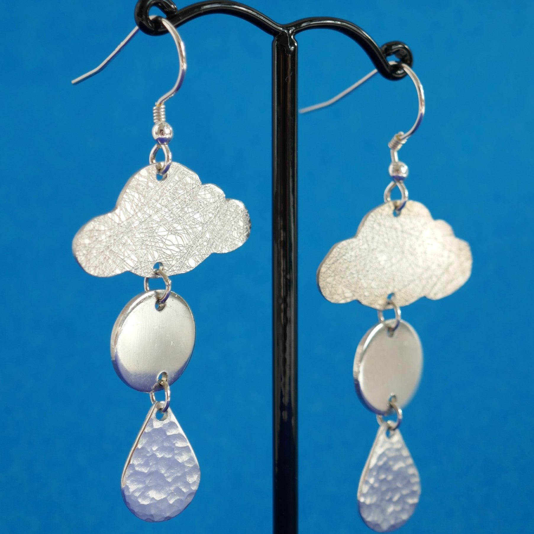 These statement earrings inspired by a nimbus cloud, feature textured clouds and raindrops.