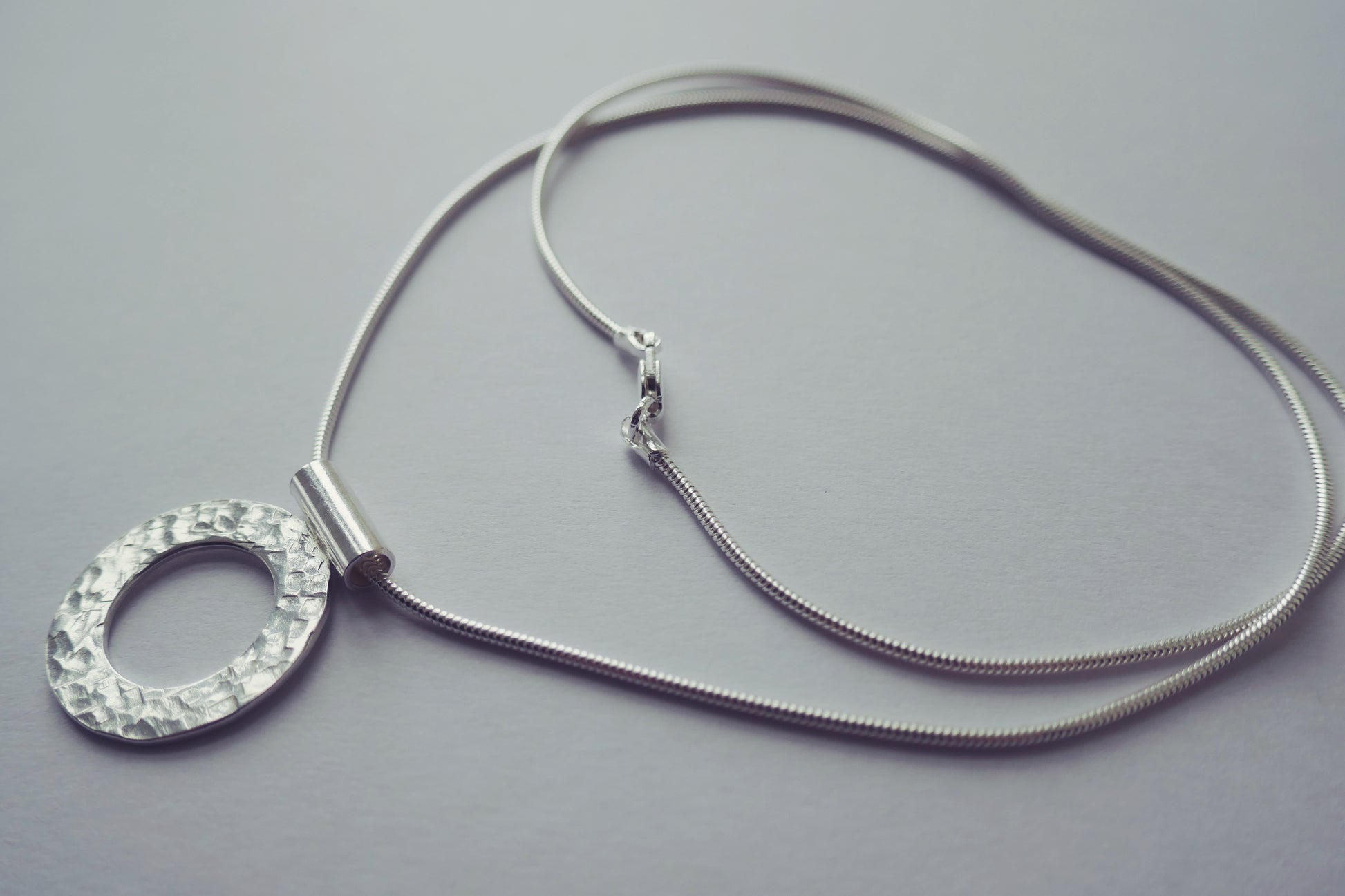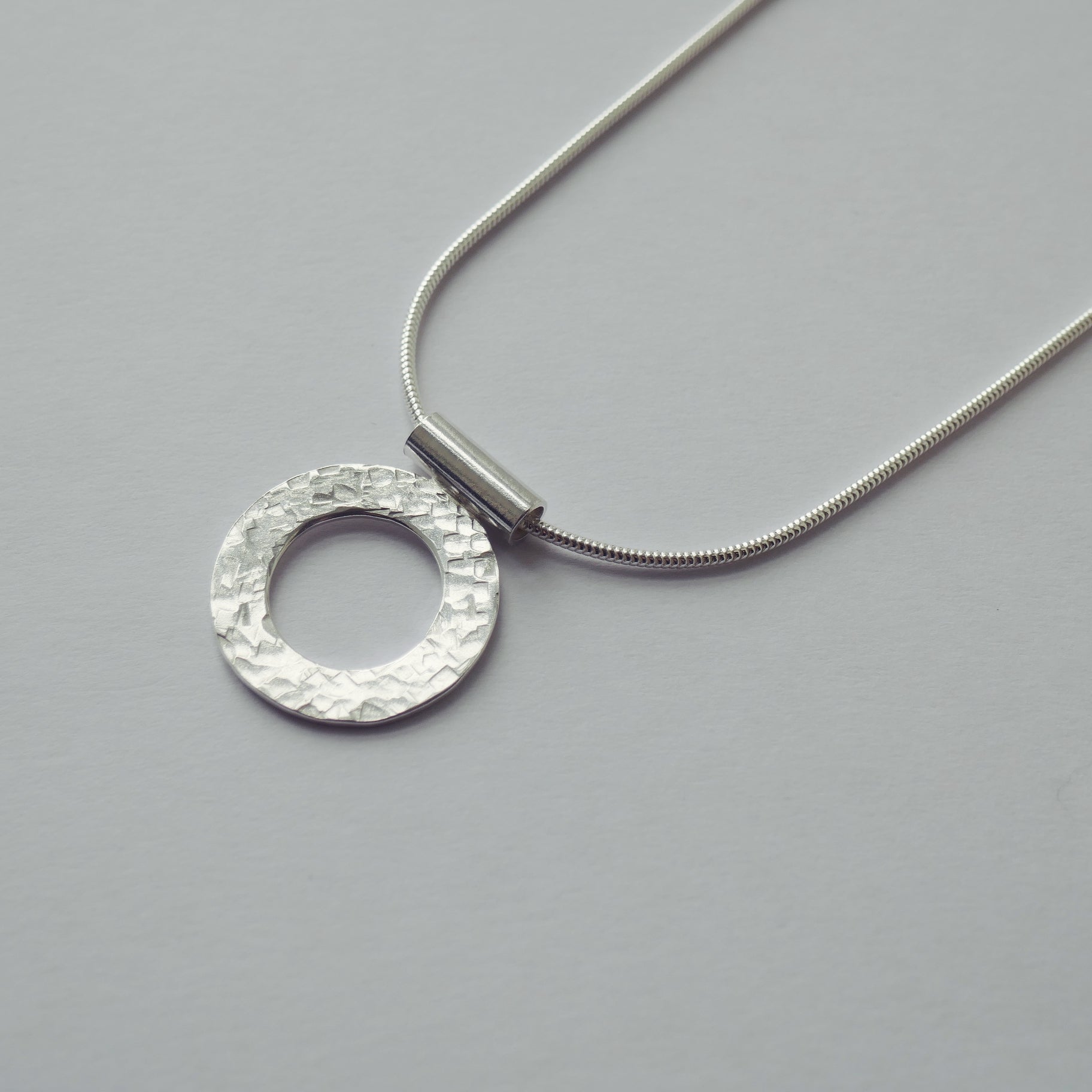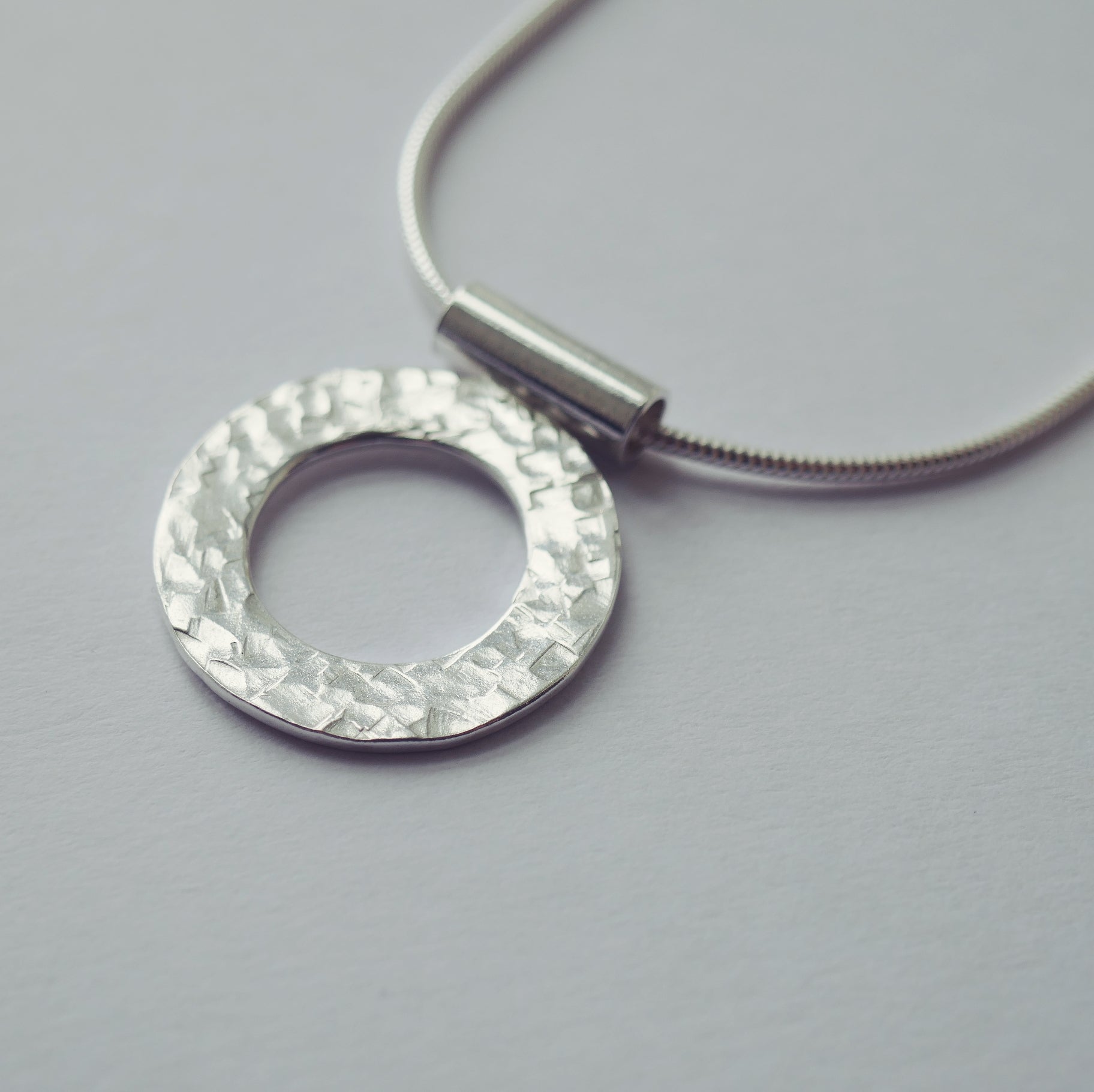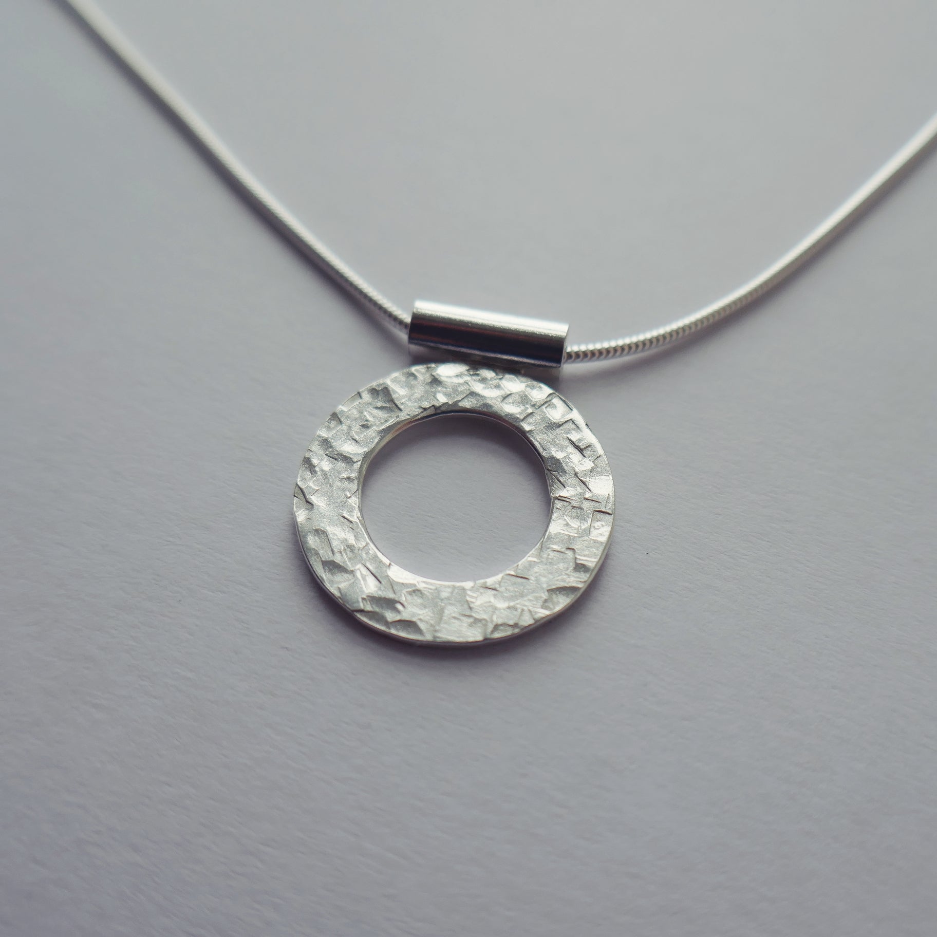 Inspired by the moon's journey as it orbits the earth, this necklace features a textured disc.
