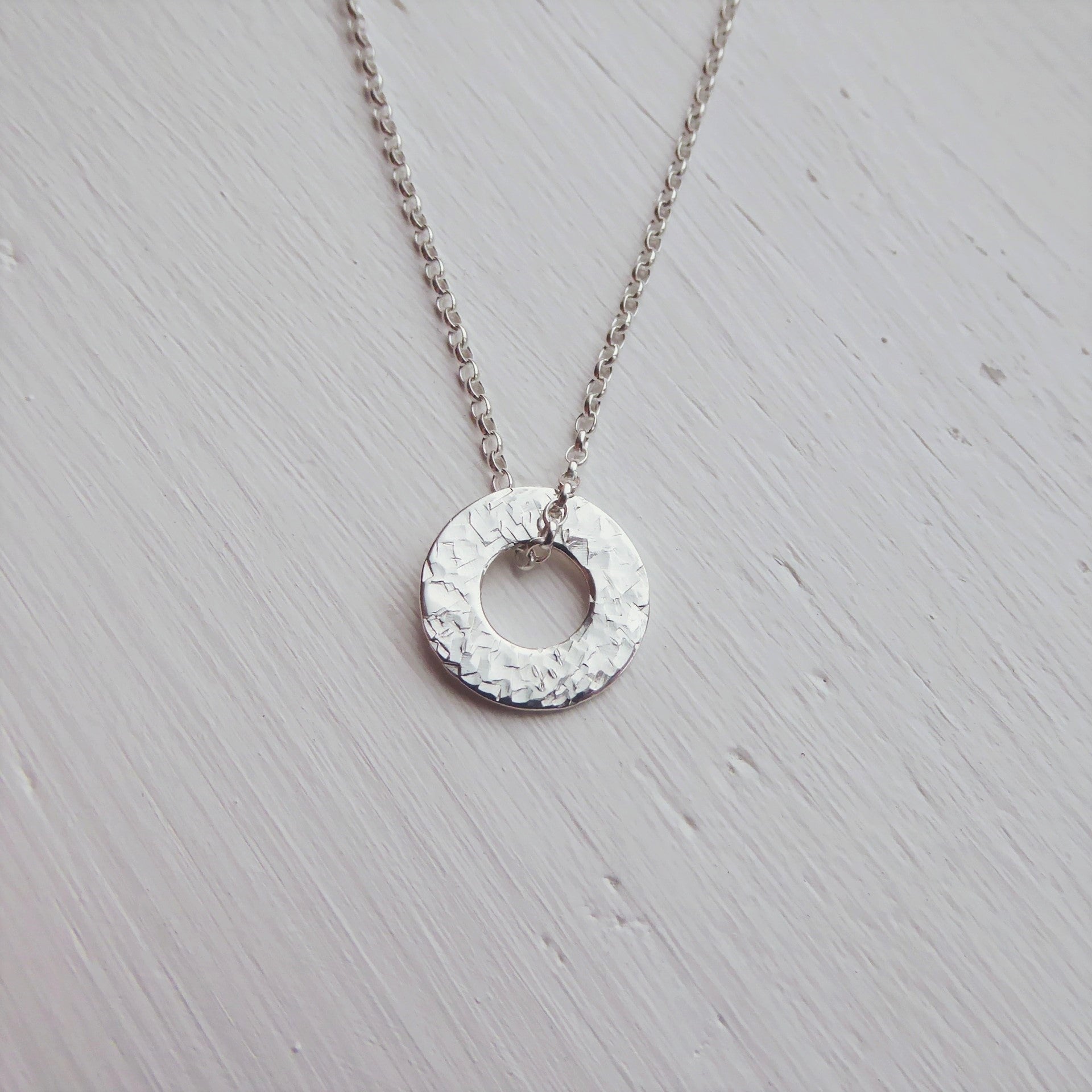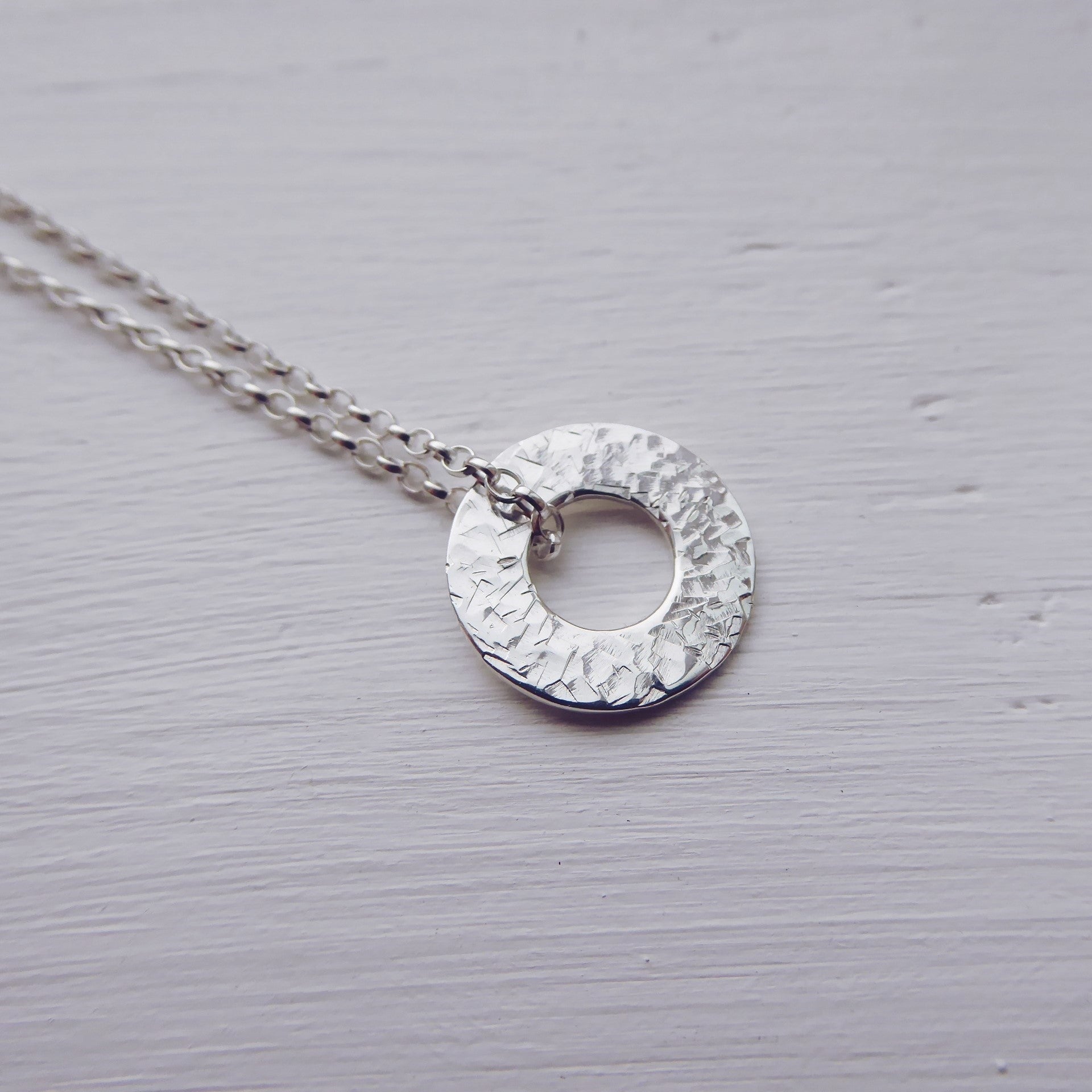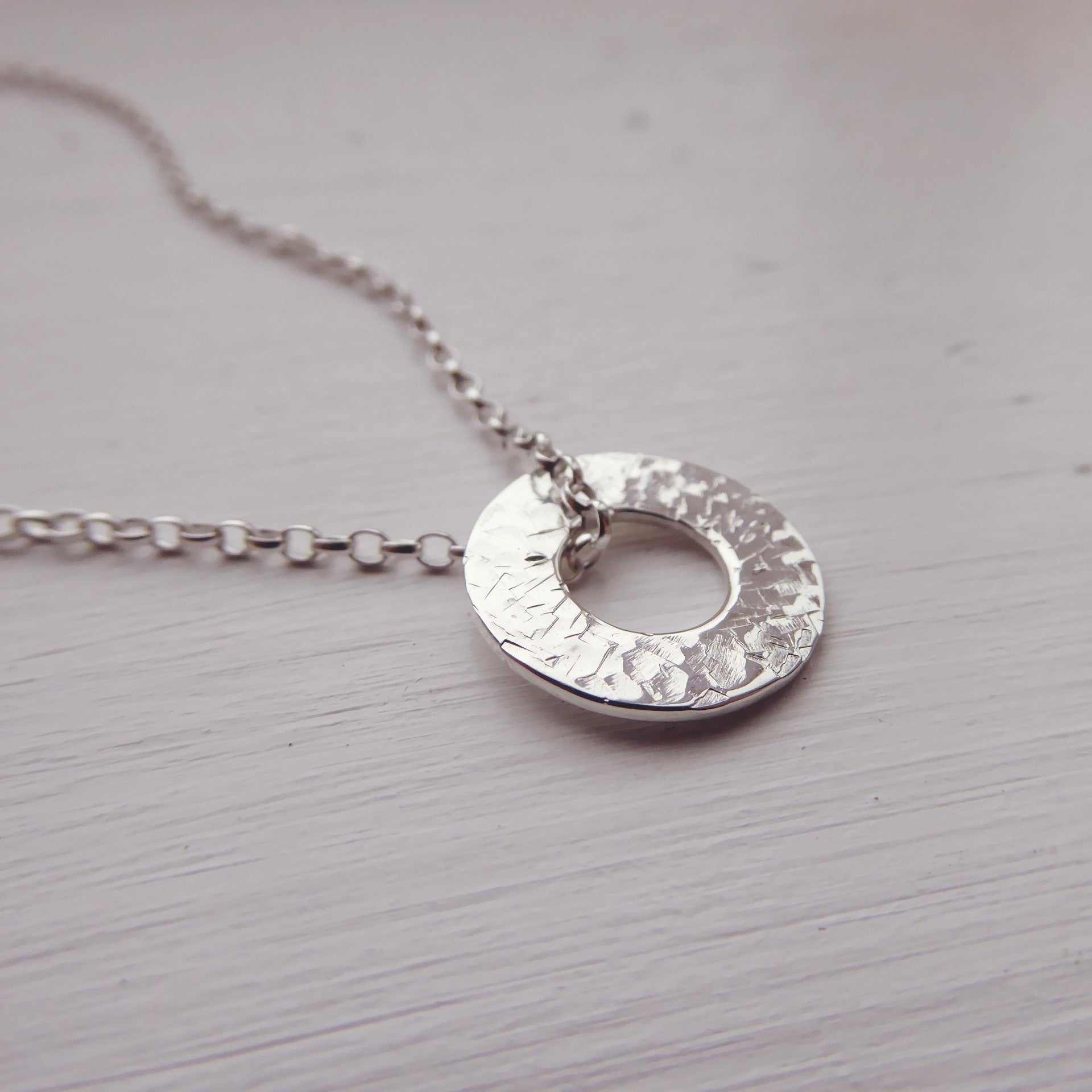 Inspired by the Moon's orbit around the earth and textured to recreate the surface of the Moon. This necklace features a sterling silver cirlce pendant which sits on a 17 inch sterling silver chain.
