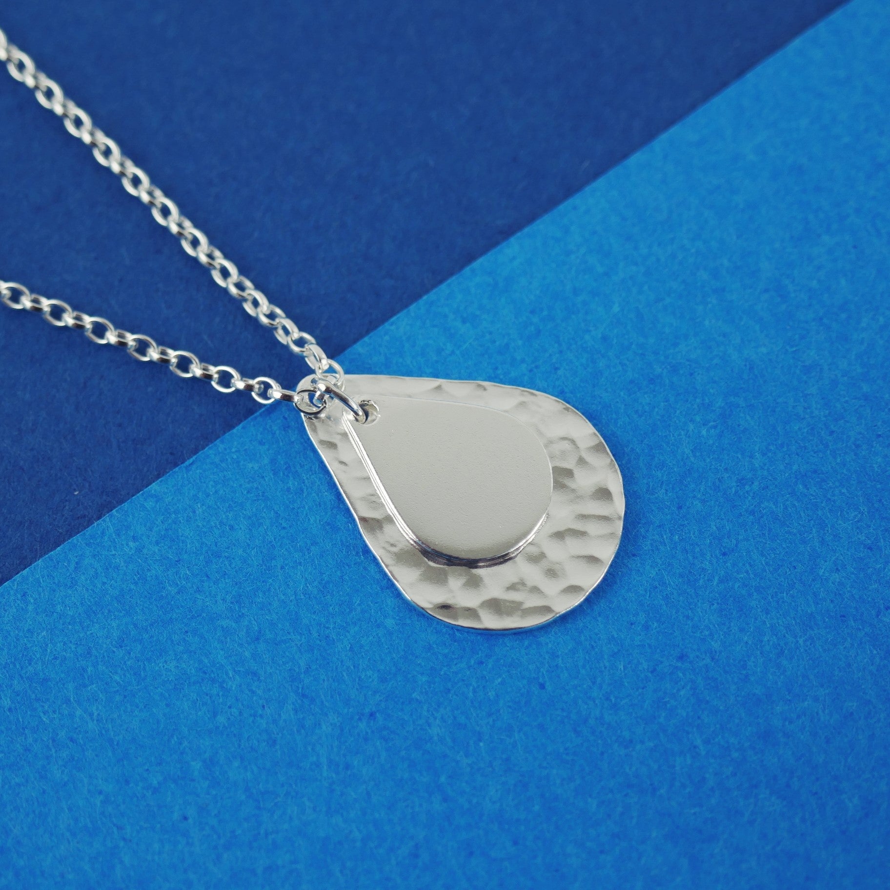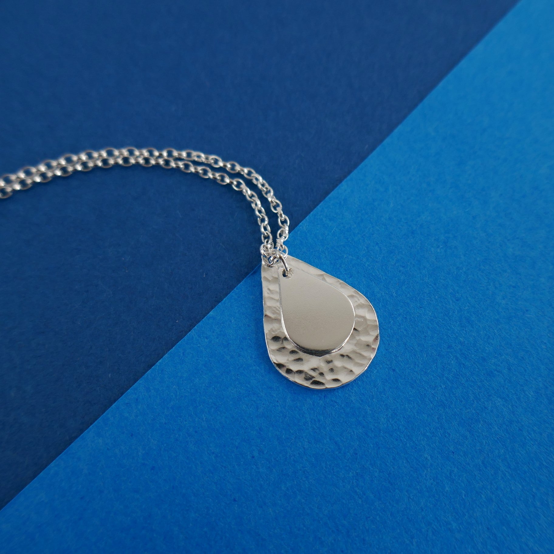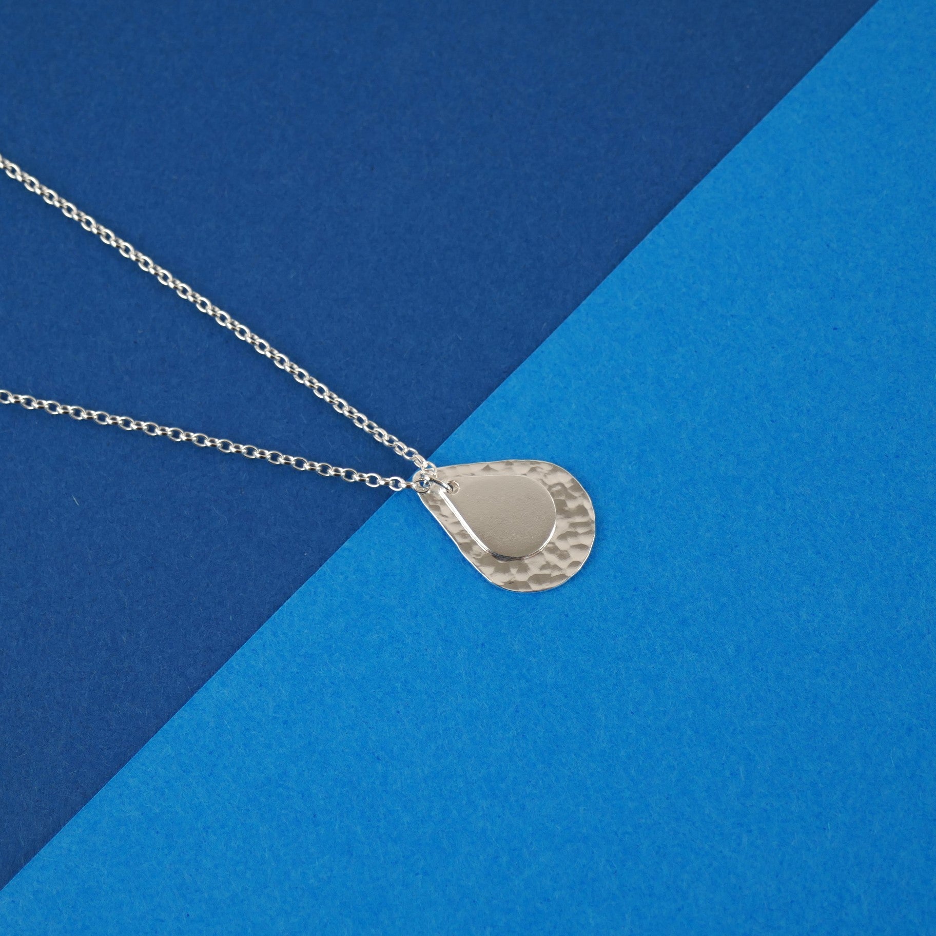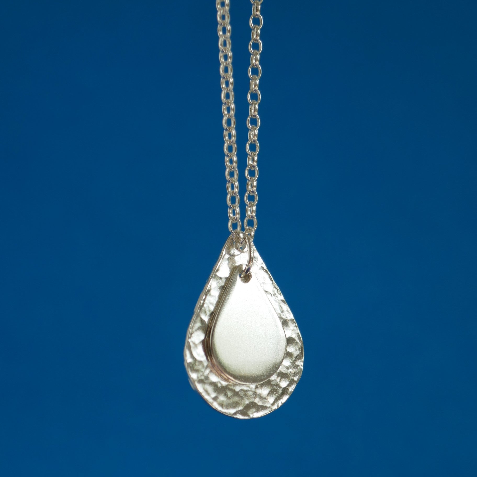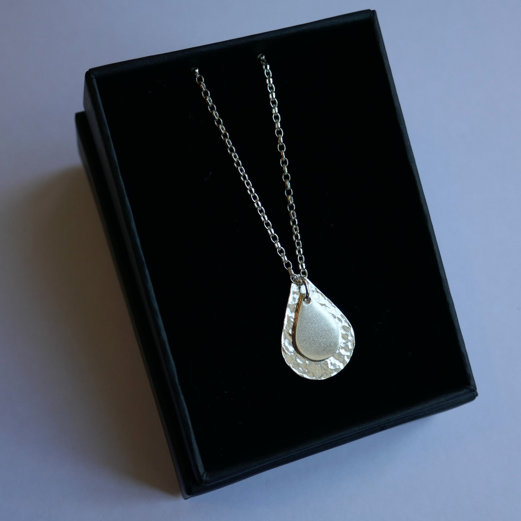 The larger pendant has a dappled texture and the smaller is has a polished finish. The pendant measures approx 2.3cm in length and sits on a 18 inch chain.