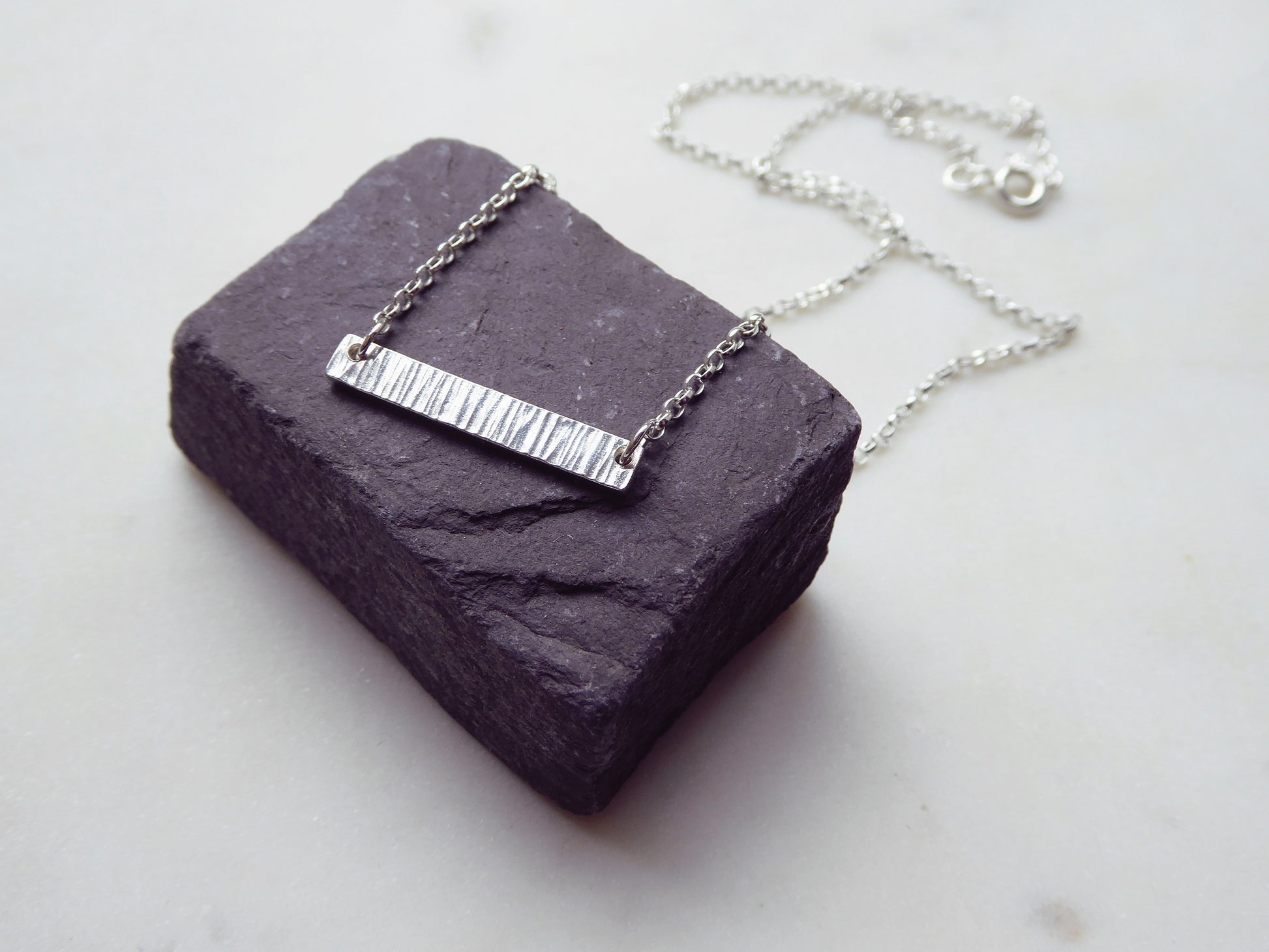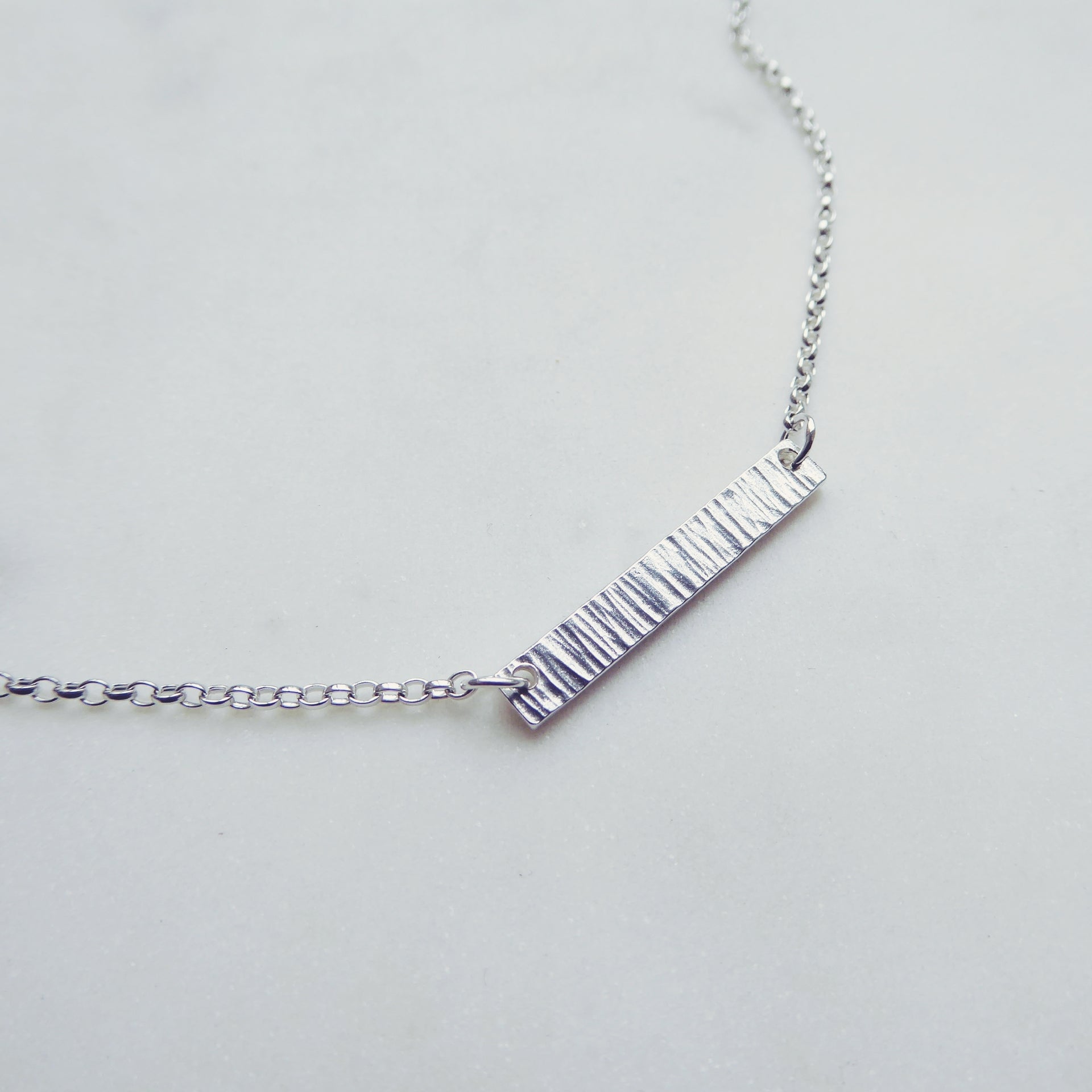 This necklace features a small sterling silver bar. The bar has been given a hammered ridge texture to recreate a rocky surface.