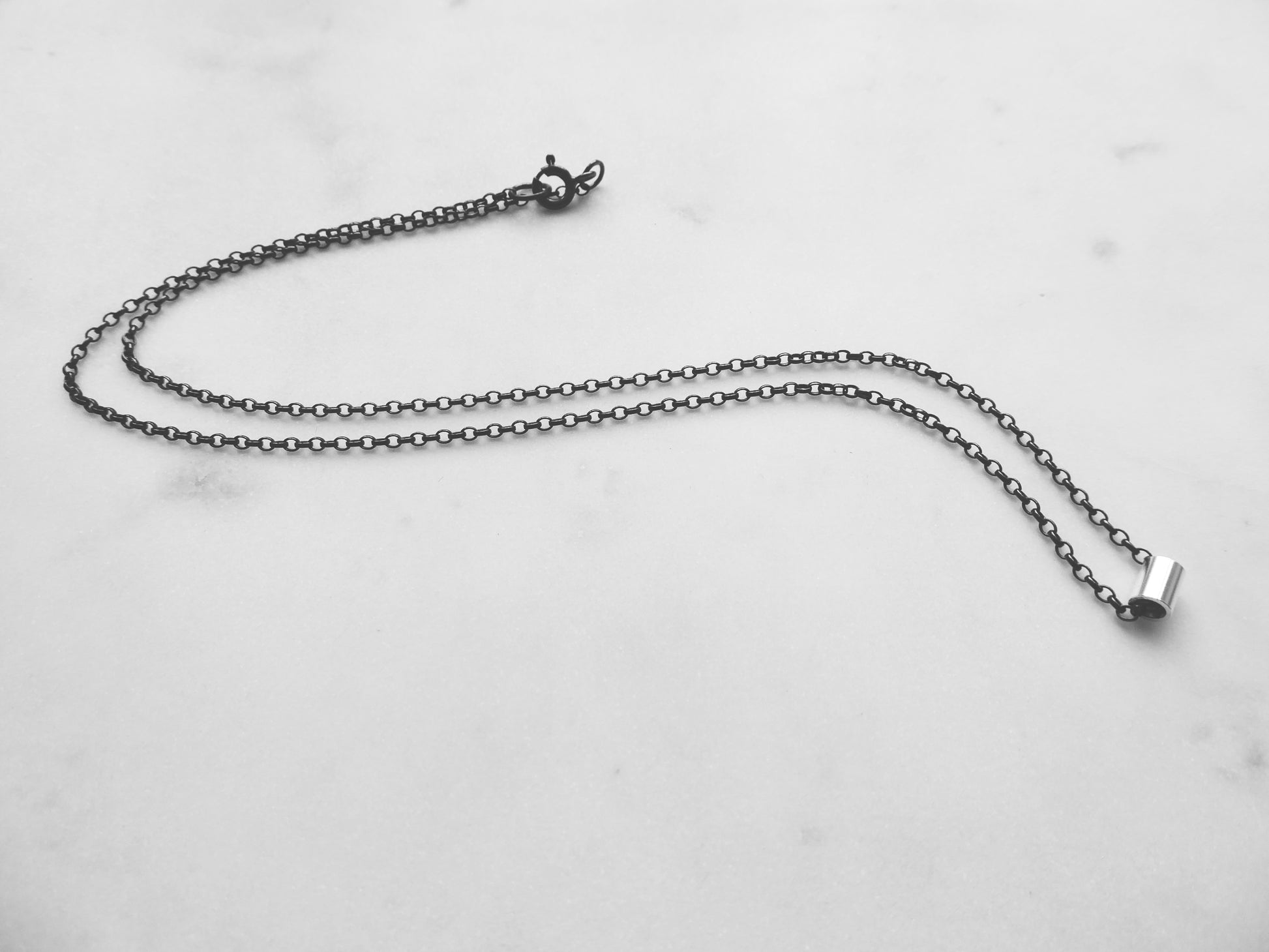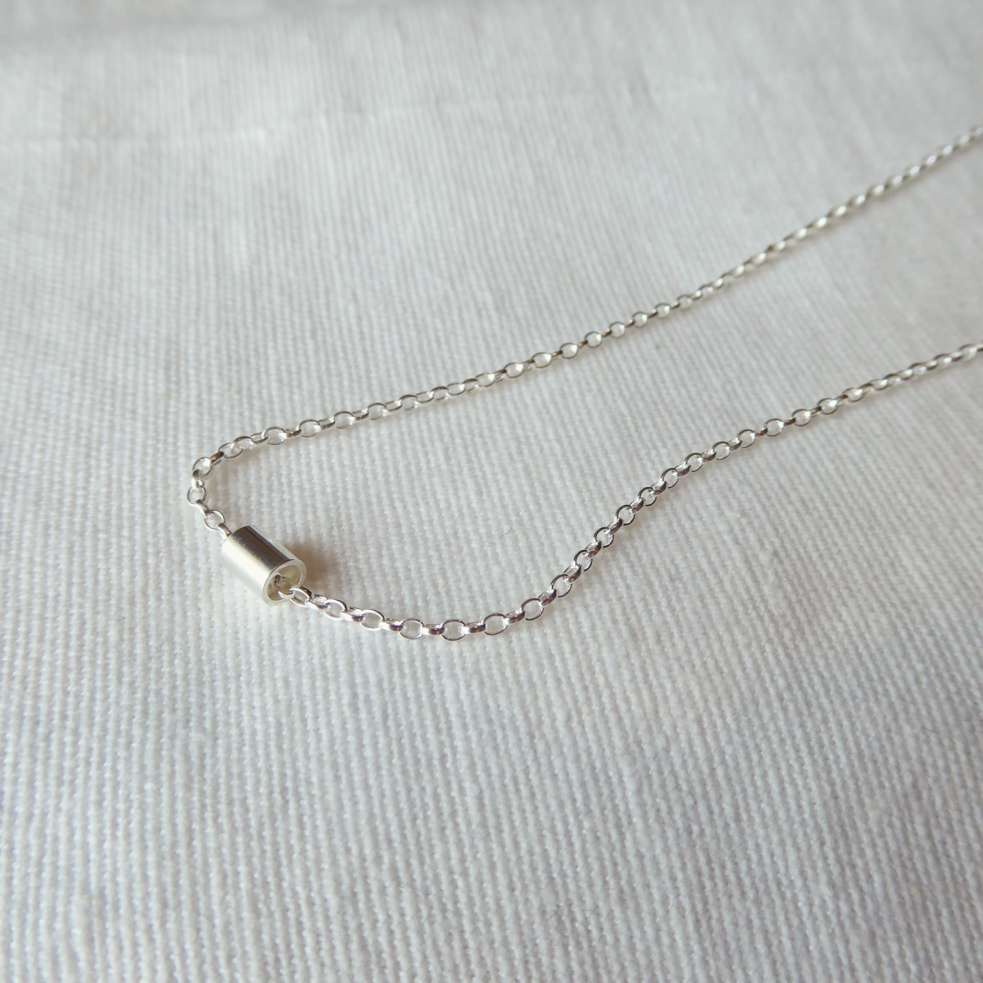 This minimal necklace features a small silver tube on a 17inch chain.